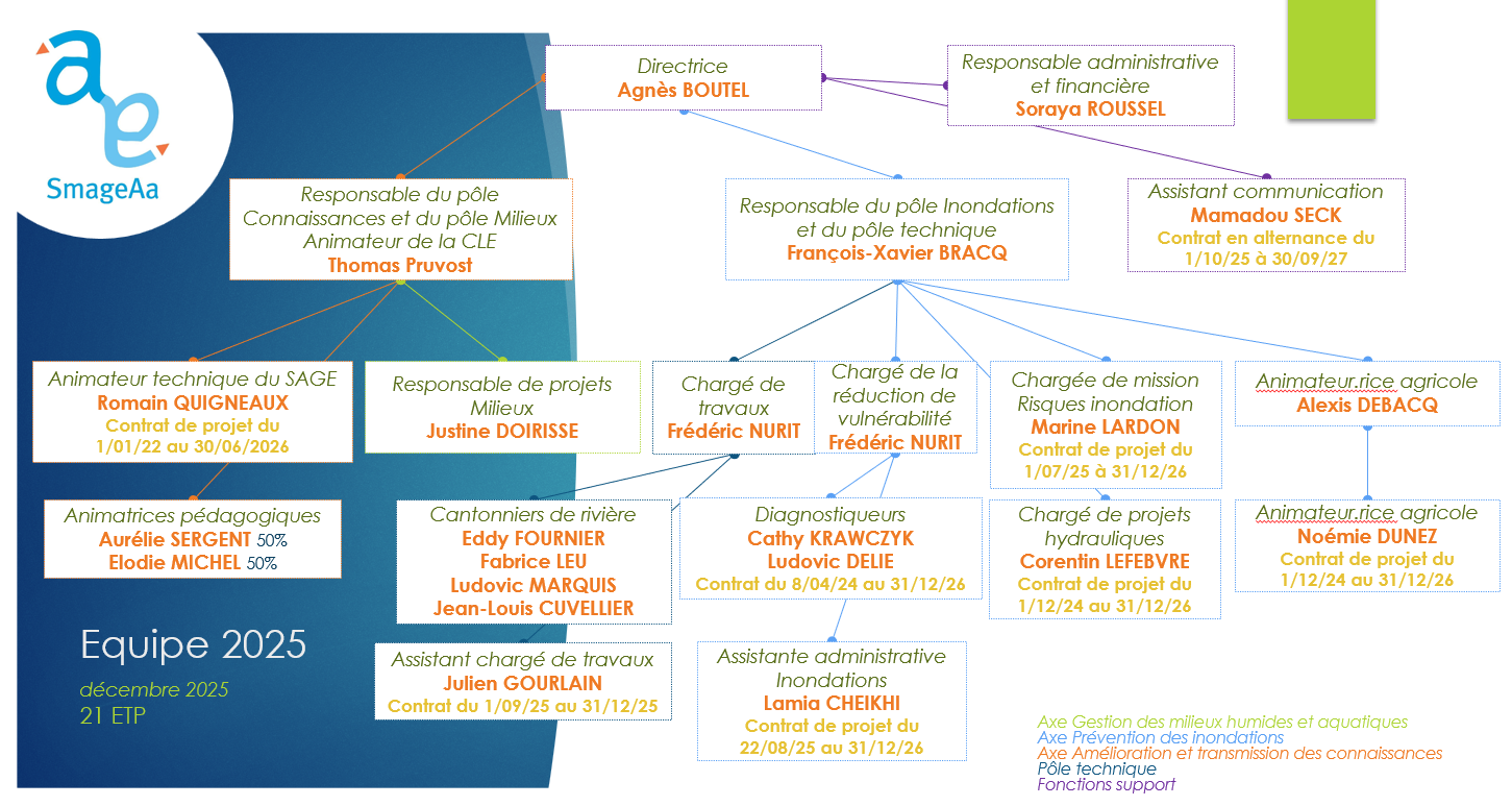 Le personnel du SmageAa est constitué d’une équipe de vingt et une personnes dont deux mi-temps. Suite aux crues de l'hiver 2023-2024, il est temporairement renforcé.